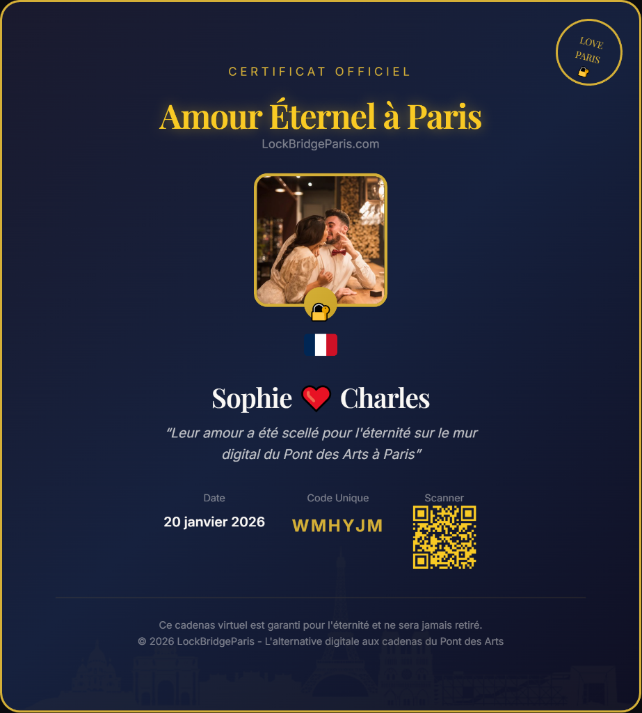 Un certificat d'authenticité officiel vous est délivré, témoignant de votre amour scellé dans la Ville Lumière. Parfait à offrir ou à encadrer.